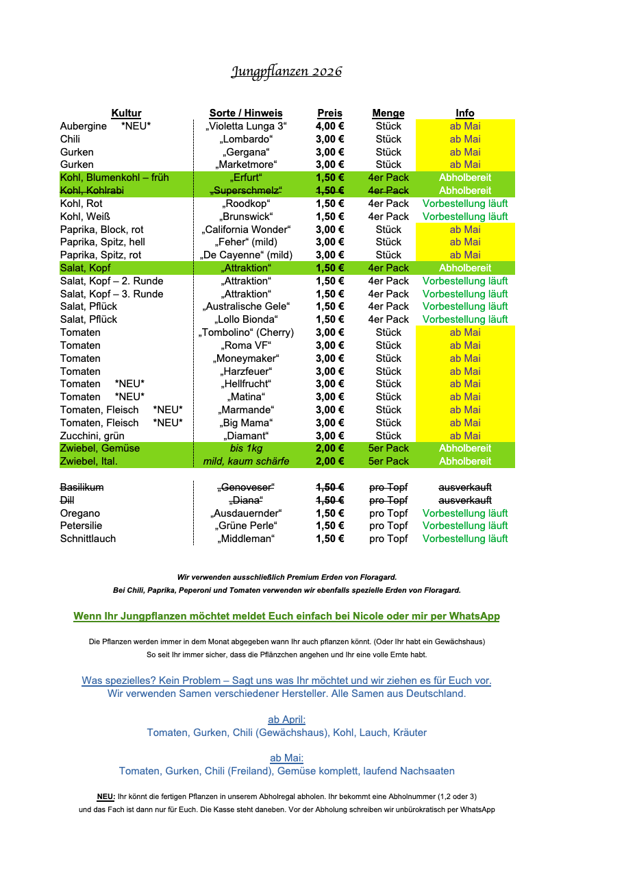 Hier findet Ihr eine Übersicht unserer Jungpflanzen die wir zum Kauf anbieten. Es erfolgt kein Versand, Abholung und freie Auswahl direkt bei uns auf dem Hof in 26607 Aurich. Den genauen Termin wann es losgeht geben wir hier bekannt.
