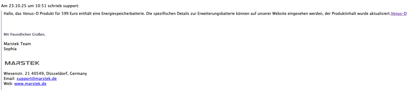 Ich hätte ja gar nichts weiter gesagt, aber zuvor hatte ich den Support von Marstek angeschrieben und expliziet nach dem System und der Grundausstattung gefragt. Als Antwort habe ich erhalten: