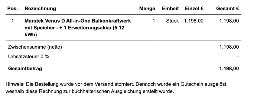 Wir haben uns für Ecoflow entschieden (erstmal). ABER das war haarscharf. Wir hatten ein System bei Marstek bestellt. Das neue Venus D System sollte für die Haupteinheit + einem Erweiterungsakkus nur 1.198,- Euro kosten. Die Kapazität lag bei 5,12 kWh (2x 2,56 kWh). Das war ein richtiges Schnapper! Allerdings wurde die Bestellung nach ca. 5 Tagen storniert mit der Begründung "Preisfehler". Abgefertigt wurde man dann noch mit einem 20 Euro Gutschein der auch noch zeitlich begrenzt war.
