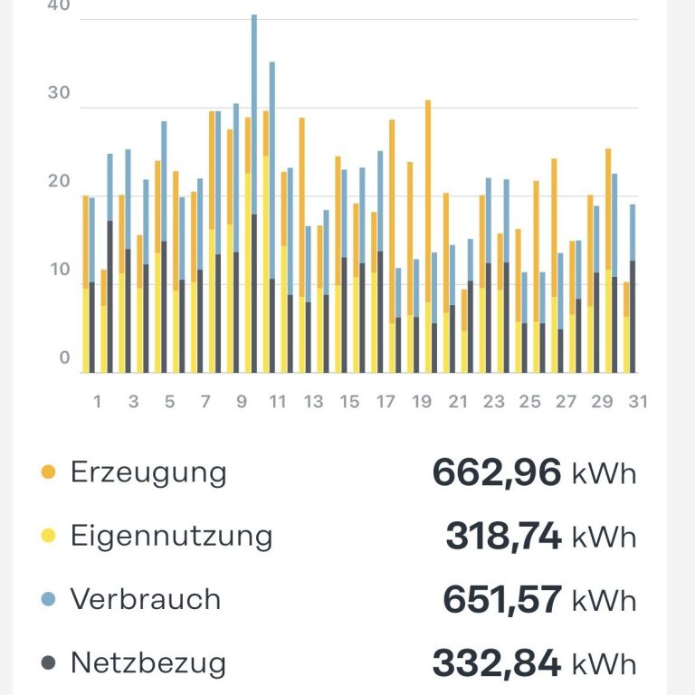 Da wir mit unserer Anlage sehr zufrieden sind und glücklicherweise eine optimale Süd-West Ausrichtung haben erzeugt die Anlage auch richtig viel Strom. Tagesspitzen mit bis zu 32 kWh im Sommer sind keine Seltenheit.